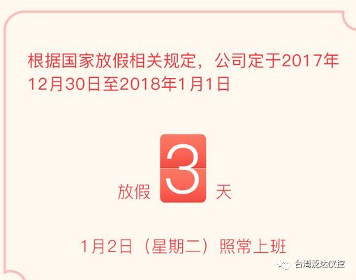 元旦即将来临,根据国家相关部门关于2018年元旦节假期安排的通知,结合我公司工作实际情况安排如下:2017年12月30日至2018年1月1日共计三天,1月2日(星期二)正常上班。放假期间,请各分公司,各部门关好电闸、锁好门窗,做好安全防范,在此期间并做好人员值班安排。