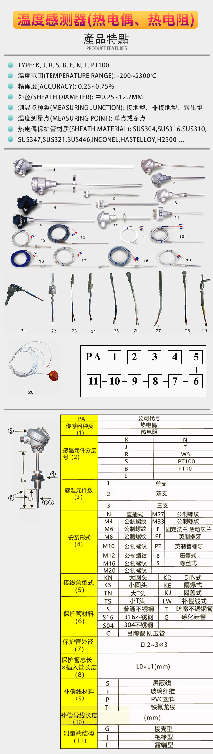 7.热电偶保护管材质(SHEATH MATERIAL): SUS304, SUS316,SUS310,SUS347,SUS321,SUS446,INCONEL, HASTELLOY, H2300-...
